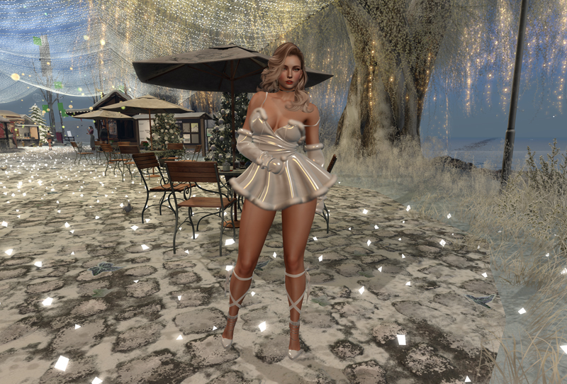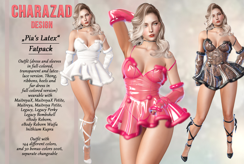 The Secondlife Outfit “Pia’s Latex” includes dress and sleeves in full-colored, transparent and latex-lace version. Thong, ribbons, fur dress and heels in full-colored version.
