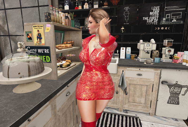 The Secondlife Outfit “Zoey’s Latex” includes dress in full-colored, transparent and latex-lace version, boots in full-colored version.